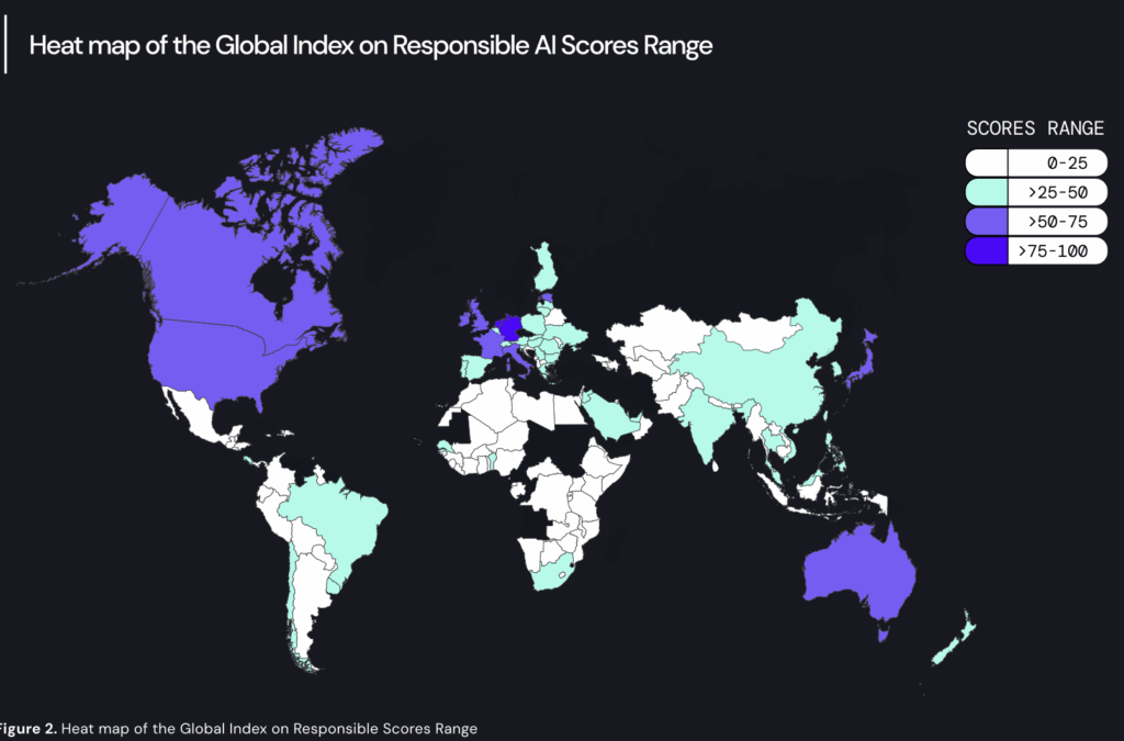 The headline insight is sobering: over two-thirds of countries score below 25 out of 100, with weak or nonexistent responsible AI frameworks. Even where national AI strategies exist, they often lack enforceable safeguards or mechanisms for redress when AI causes harm. Non-state actors are frequently the drivers of progress, compensating for gaps in government action.